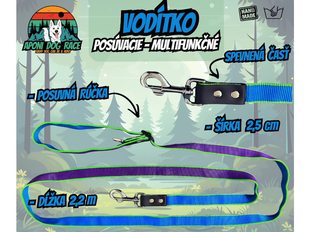 Vodítko je výnimočné vďaka posuvnej a multifunkčnej konštrukcii. Rúčka je nastaviteľná po celej dĺžke až ku karabíne, čo umožňuje plynule meniť dĺžku vodítka podľa aktuálnej potreby.